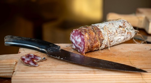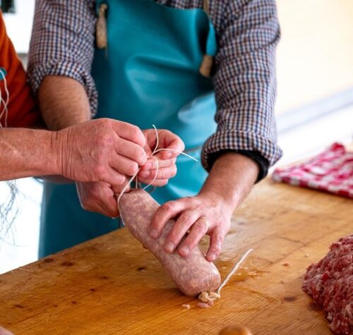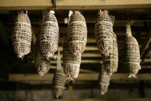 Affumicatura arte antica – Le radici dell’affumicatura in Carnia risalgono ai Celti che, non conoscendo l’uso del sale, utilizzavano erbe aromatiche e fumo per conservare gli alimenti. L’affumicatura rappresenta una vera e propria arte in Carnia, dove la conoscenza di questa tecnica di conservazione si tramanda da tempi antichissimi. Infatti soprattutto in un territorio montano come la Carnia, caratterizzato da isolamento e difficoltà nei collegamenti, l’affumicatura era uno dei metodi più diffusi per conservare gli alimenti. I salumi erano (e sono) i principali prodotti sottoposti all’affumicatura e in Carnia se ne è sviluppata una notevole varietà, dato che l’isolamento dovuto alle montagne e alle vie di comunicazione disagevoli ha fatto sì che quasi ogni paese avesse il proprio segreto nel prepararli. Depositari di questo sapere erano i purcitàrs – i norcini locali, ciascuno con una propria ricetta per insaporire le carni ed alcuni ancora attivi – che erano invitati dalle famiglie a preparare i salami. Sul gusto finale influiscono poi non solo gli ingredienti, ma anche il luogo di stagionatura, la cantina che gioca un ruolo fondamentale nel processo di maturazione, contribuendo a rendere ogni salume unico nel suo genere. Questo fa sì che i salami abbiano un sapore simile, ma mai uguale.