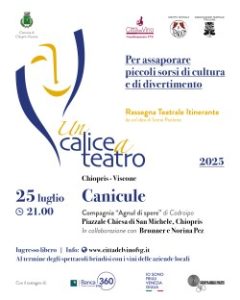 Prosegue “Un calice a teatro”, la rassegna estiva del Coordinamento delle Città del Vino del Friuli Venezia Giulia in collaborazione con Compagnia Teatrale El Tendon di Corno di Rosazzo, che unisce opere teatrali a degustazioni di vini regionali. Sostegno alla rassegna della Regione Autonoma Friuli Venezia Giulia, Io sono Fvg e Banca 360 Fvg e in collaborazione con Associazione Teatrale Friulana. Ingresso libero.