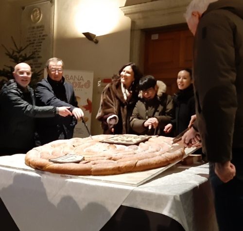 Con il sindaco cividalese, che ha appunto fatto gli onori di casa (assieme all’assessore Angela Zappulla), è intervenuto anche il collega di San Pietro al Natisone, Cesare Pinatto, a significare uno degli elementi unificatori di un vasto territorio, in cui la cultura friulana s’incrocia con quella slava, qual è proprio la gubana. Come detto, la Dorbolò di San Pietro – che ha un punto di riferimento in largo Boiani, proprio di fronte al Caffè San Marco, nel cuore di Cividale – ha realizzato per in terzo anno consecutivo il dolce da Guinnes dei primati – e quindi “più grande del mondo”! – che ha attratto turisti e residenti in una magica serata di Capodanno nella città ducale. Moltissimi gli avventori che si sono assiepati nel loggiato municipale per assistere al taglio della “gubana gigante” e alla sua degustazione per un brindisi di Capodanno unico nel suo genere. Il tutto finalizzato a promuovere proprio il dolce tipico del Cividalese.