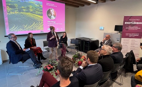 «Il vino è oggi un vero motore di sviluppo – ha chiosato il manager del Distretto, Edi Sommariva –, in grado di generare valore e avviare la conoscenza a tuttotondo del territorio che lo produce. Qui in Fvg abbiamo tutto per farlo bene e in più abbiamo diversi vantaggi rispetto ad altre regioni italiane. Il 90% della superficie a vite, per esempio, è destinato alle produzioni di qualità, superando di quasi venti punti sia il Nordest sia l’Italia. L’enoturismo, da comparto di nicchia diventa così leva di sinergie e di un ecosistema territoriale di sperimentazione e innovazione, di cui il Distretto del commercio Friuli orientale vuole farsi interprete. La cantina è punto di partenza, in un modello orizzontale in cui in vino “contamina” positivamente il territorio: non solo ambasciatore della regione, ma chiave d’accesso al territorio».