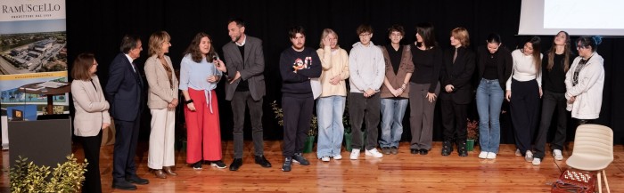 In copertina e qui sopra, alcune delle bellissime etichette realizzate dagli studenti del Galvani di Cordenons; all’interno, immagini della cerimonia: con il dirigente scolastico e gli insegnanti, il presidente Gianluca Trevisan e il direttore Rodolfo Rizzi; l’auditorium gremito, gli autori Stefano Cosma e Cristina Burcheri, il coordinatore Fvg Città del vino Tiziano Venturini e il docente Walter Tomada.