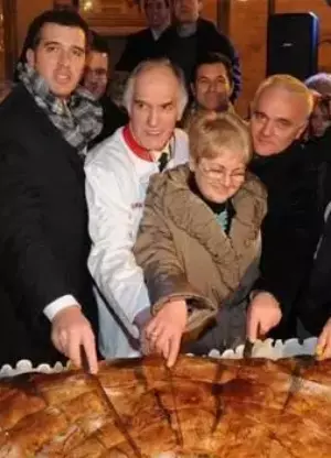In copertina e all’interno la gubana gigante dell’anno scorso e la folla arrivata a Cividale per assaggiarla; qui sopra, il compianto Berto Blasutig al taglio del dolce tipico negli ultimi anni della sua partecipazione.