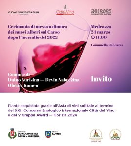 Ora quel sogno diventa realtà. Lunedì 24 marzo in località Medeazza – Medjevas, sul confine tra Italia e Slovenia e tra i Comuni di Duino Aurisina – Devin Nabrežina e Komen, alle ore 11 ci sarà la messa a dimora di una cinquantina di piante arboree tipiche del bosco carsico, in un terreno messo a disposizione dalla Comunella Medeazza – Jus Medjevas (nel Carso le Comunelle sono antichi soggetti che regolano le terre collettive patrimonio dell’intera comunità locale). All’evento interverranno i sindaci dei due Comuni, i rappresentanti del Coordinamento del Friuli Venezia Giulia delle Città del Vino, guidato dal vicepresidente nazionale Tiziano Venturini, autorità regionali e locali.